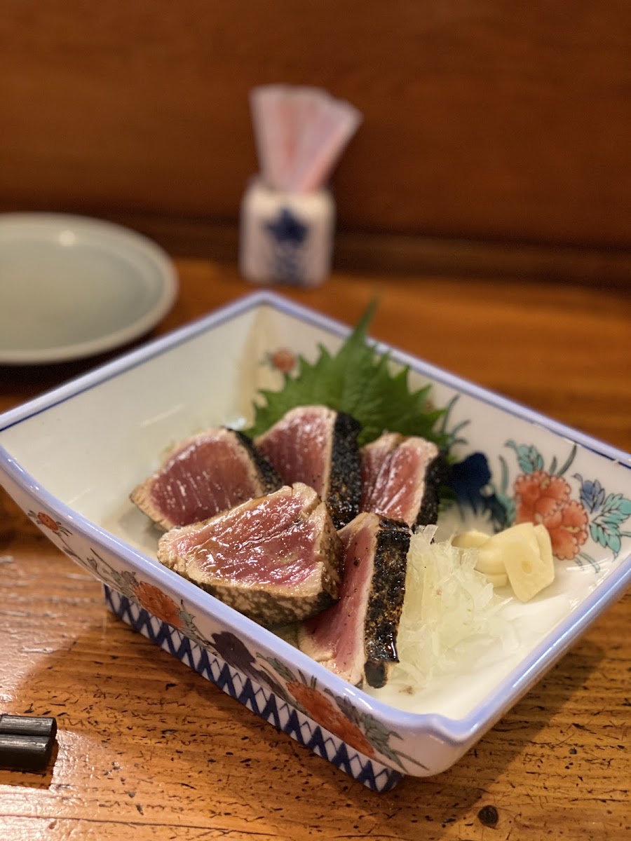 This restaurant is known for serving some of the freshest and most unique dishes in the area. One standout item on the menu is the カツオの塩たたき (Salted Bonito Tataki), which is a specialty of the house. The fish is lightly seared and served with a perfect balance of seasoning, offering an explosion of flavors. Another fan-favorite is the 普通のたたき (Regular Tataki), a slightly different take on the same dish, allowing diners to taste the versatility of this classic Japanese delicacy.